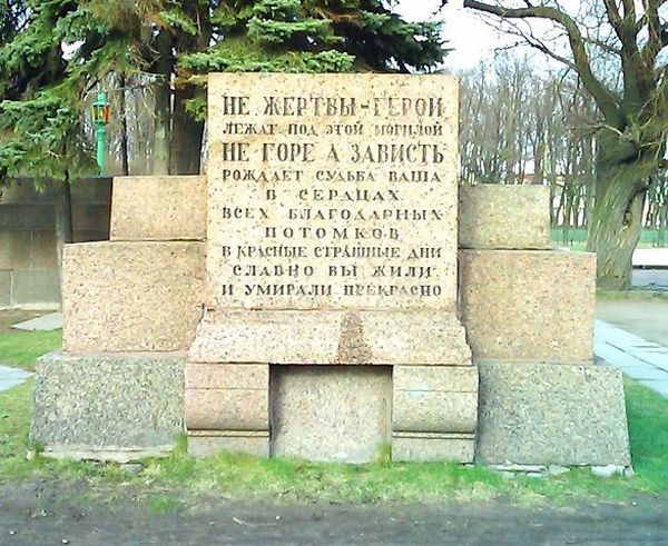 Памятник жертвам революции на Марсовом поле в Петрограде со стихами Анатолия Луначарского. Стихи выражают отношение красных к проблеме «героев и жертв».