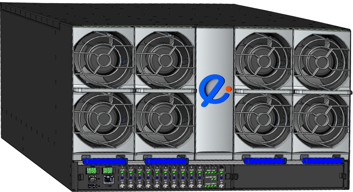 Идеология решения заключается в том, что общий конструктив шасси схож с конструктивом блейд-сервера и заключает в себе общее питание и охлаждение серверов-лезвий (в нашем случае вычислительных модулей), но классический мидплейн отсутствует.