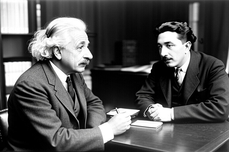 Таинственное Письмо Дата: 18 апреля 1922 года Альберт Эйнштейн, сидя за письменным столом в своей уютной кабинетной комнате в Берлине, углубился в изучение своих теорий. Стол был завален бумагами, и письменные инструменты разбросаны в хаосе. Внезапно, стук в дверь прервал его размышления. - Да, прошу! - Эйнштейн поднял глаза. Дверь скрипнула, и в комнату вошел его ассистент, Юлиус. - Простите, профессор, но вам пришло письмо. Очень необычное письмо, - Юлиус протянул листок бумаги. Альберт взял письмо и рассматривал его внимательно. Оно было написано красивым почерком, но адресат не указан. - От кого это письмо? - спросил Эйнштейн. - Неизвестно, профессор. Оно пришло без конверта, просто лежало на вашем столе, - ответил Юлиус. Альберт вскрыл печать и начал читать: "Уважаемый господин Эйнштейн! Ваше научное видение и интеллект привлекли мое внимание. Я желаю поделиться с вами определенными знаниями, которые вы можете найти захватывающими. Если вы готовы пойти на это, вы найдете меня на т