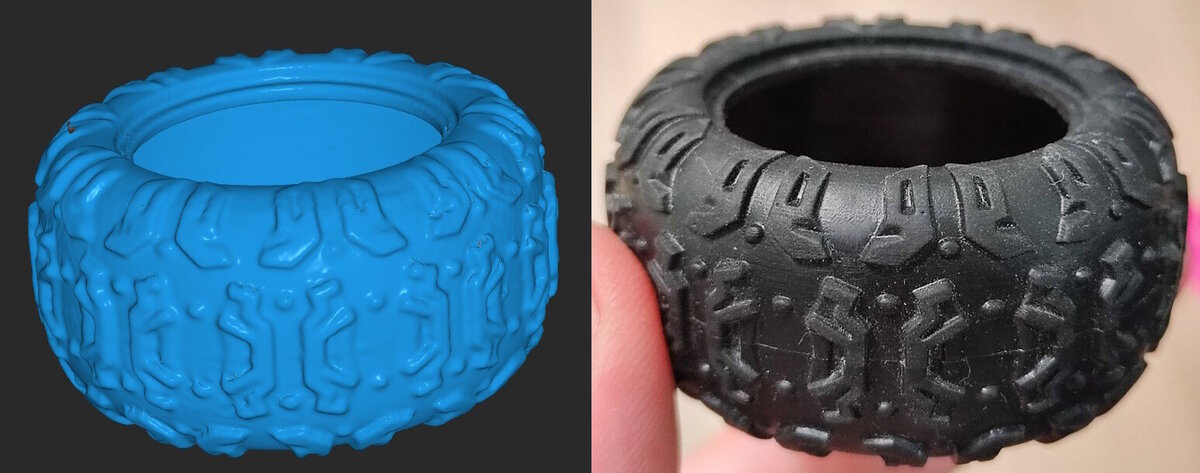Добро пожаловать, уважаемые фанаты реверс-инжиниринга, в нашу увлекательную рубрику "Отсканируй и напечатай сам"! Сегодня я с гордостью(на самом деле нет) представляю итог сканирования шины от игрушечной машинки для будущей ее печати на фотополимерном принтере. Здесь вы не найдете острые эмоции, захватывающие приключения и передовые методы анализа, которые помогут вам освоить искусство реверс-инжиниринга, так что жду ваших острых комментариев. Сегодня быстро покажу процесс сканирования, а далее надеюсь смогу распечатать из резиноподобной смолы на принтере и сравнить эталон и полученным продуктом. Собственно итог быстрого сканирования и оригинал. Шина в диаметре 5 см. Шина на машинке. Шина на поворотном столе. Интерфейс ПО Revoscan достаточно сильно меняется каждый месяц. Так что разница заметна даже с моей прошлой статьей. Получил два скана(с двух сторон) и объединил в одну модель. Итого получилось такое в невысоком разрешении. На днях запущу печать и обязательно отчитаюсь и сравню ори