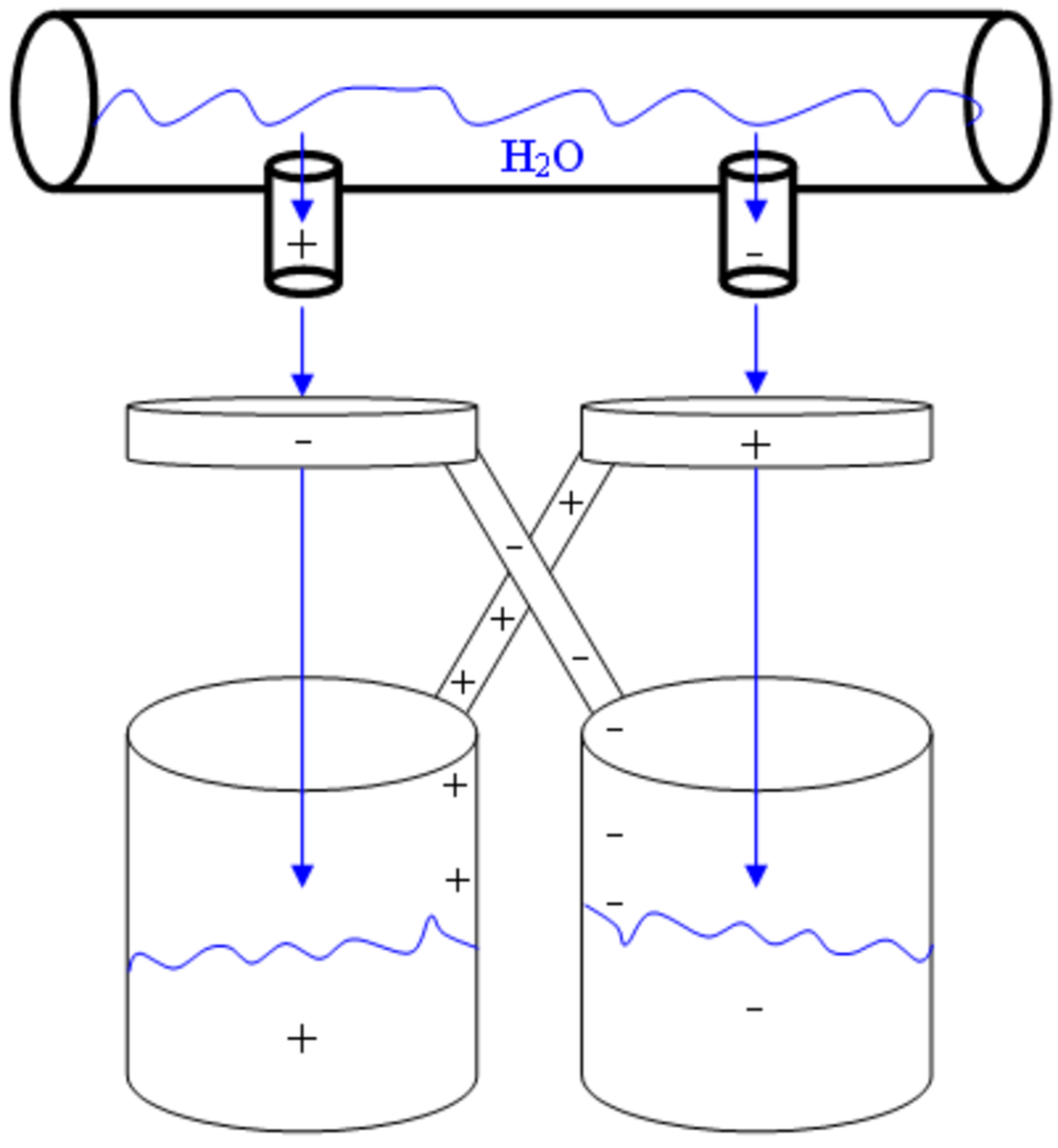 На рисунке с верху показана капельница Кельвина, это электростатический генератор, который работает за счёт электростатической индукции. Нижние банки являются конденсатором- в них накапливается заряд (банки металлические) . Заряд перетекает на металлические кольца, расположенные над противоположными банками, и в кольцах образуется напряжение соответствующее напряжению в банках. Через кольца протекает вода(капельками) проходя через кольца капли заряжаются (по принципу электростатической индукции). Заряженные капли уже падают в банки и отдают заряд банкам, в банках вырастает заряд, и соответственно вырастает заряд на кольцах, и значит следующие капли заряжаются сильнее. А я же предлогаю исполнить данную конструкцию чисто в механической планировке, т.е. что-бы заряд передавался не через воду, а через металлические объекты, и замкнуть цикл,, чтобы не требовалось постоянно добавлять "переносчик зарядов". И вот что у меня получилось. Красный и синий круги(что расположены за большими круга