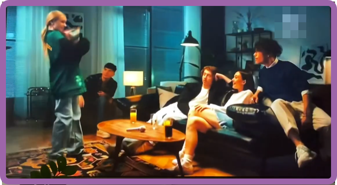 В кадре молодежная компания. На диване сидят девушка и парень. В центре -стол.