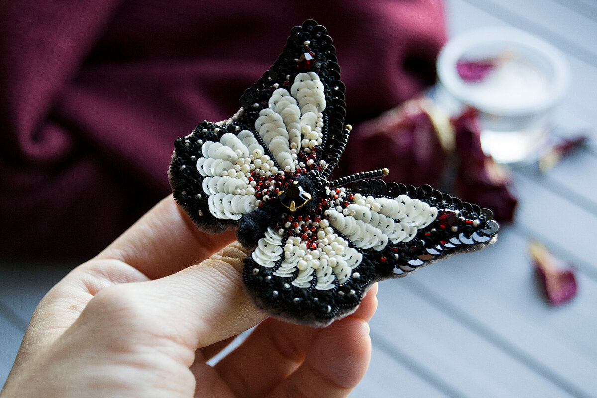 Слышали о правиле 10 000 часов? Суть в том , что достичь мастерства можно, если потратить на практику определенное количество времени. Ученые даже вывели волшебное число, ведущее к мастерству: 10 000 часов. На мой взгляд, это время утрированно и для разных направлений необходимо разное количество времени. Сколько я вышивала в своей творческой жизни, я конечно не считала. Тем не менее, считаю, что это правило работает. Больше практики - больше мастерства! Покажу свой путь в вышивании на примере броши бабочки, по одному мастер-классу. Сначала я училась по бесплатным мк в сети. Это был один из них. Причём я уже использовала только материалы высокого качества. Но здесь это даже не заметно. Данную бабочку я не дошила: грубые стежки, неровно пришитый бисер, плохо сочетаемые материалы. Дубль два. Здесь я уже завершила вышивку до готового украшения. Убрала вышивку нитками и сделала расшивку бисером более аккуратной. Но для меня все же это было не то, что я хотела. Я оставила эту идею на время,