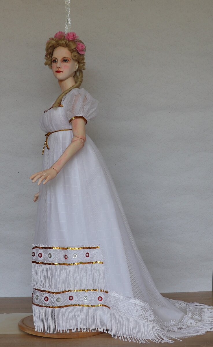Здесь буду рассматривать свою работу из проекта «Ее Сиятельство Принцесса»… Всем известно, что все русские цари женились на немецких принцессах. Вот о них и речь поведаю, о том как они одевались в зависимости от того, в какие времена жили и каков был стиль одежды в их историческую эпоху. Рассматриваю- ампир. Как правило, его делят на ранний1895-1805, средний 1805-1815 и поздний 1815-1825. Сохранились не только иллюстрации и портреты, но и подлинники. Фасонов для образцов много, крой был типичен одному, но платья очень разнились отделкой. Я выбрала такой. Это платье типично для среднего ампира. Героиня - Елизавета Алексеевна, супруга Александра 1. Урожденная немецкая принцесса Схематично платье выглядело так. Фото Инет. А его крой так. Я практически ничего не меняла. Оно на чехле. Ткани были тонкие, но не "смачивали они себя", чтоб обнажить фигуру. Всякая белая ткань дает просвет и только. Верх из тюля, ибо только это нашлось подходящее в моем "сундуке". Помните, принципиально, толь