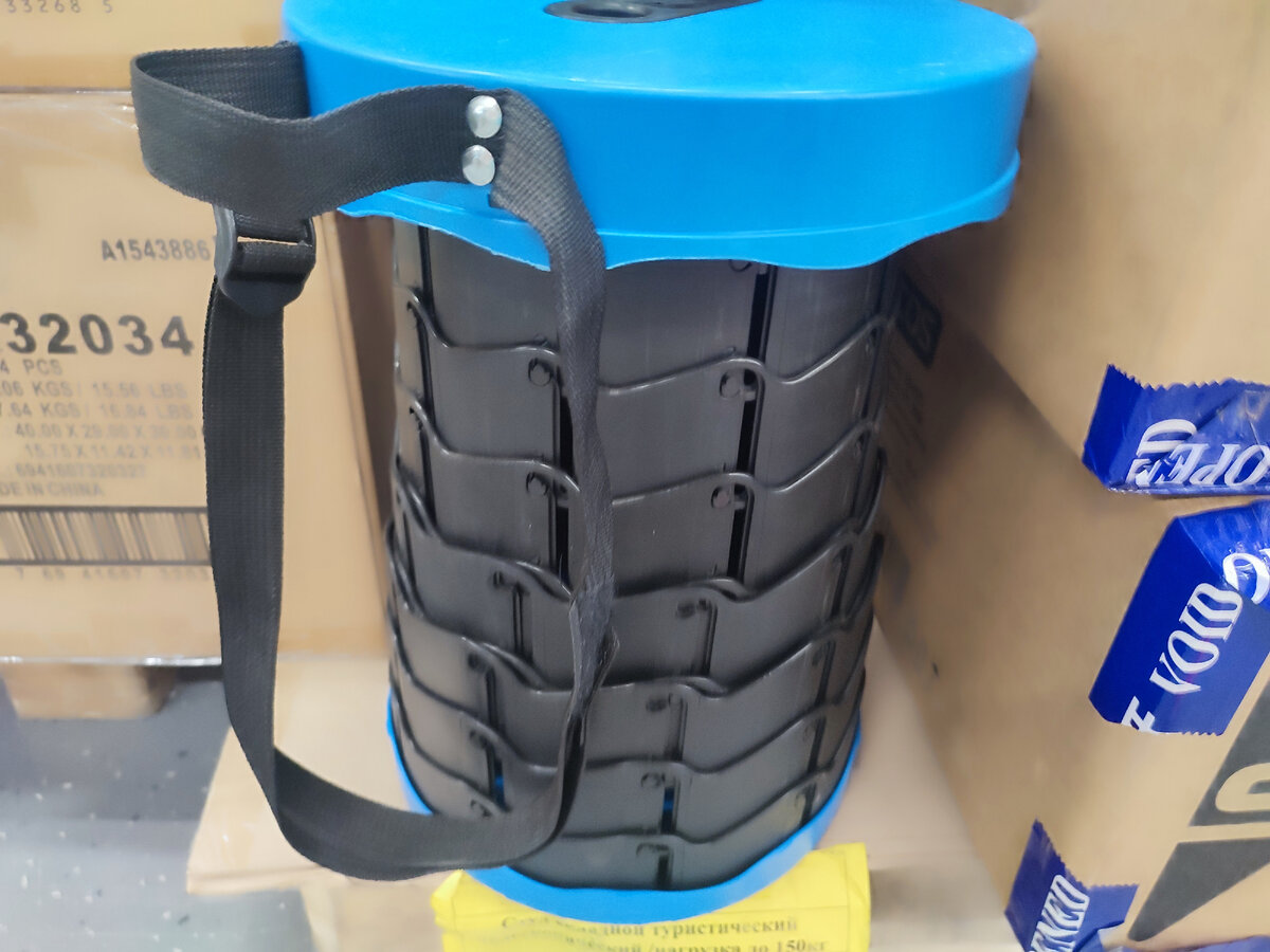 Стул складной, туристический, телескопический. Очень удобно такой брать в дорогу... когда предстоит долго идти. Складывается он в небольшую круглую коробочку, которую можно нести в рюкзаке или на плече (для этого есть специальные ремни)