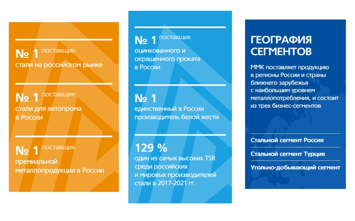 Магнитогорский Металлургический Комбинат - это поставщик стали, премиальной металлопродукции, оцинкованного и окрашенного проката, стали для автопрома. И по всем этим направлениям - лидер в России.
