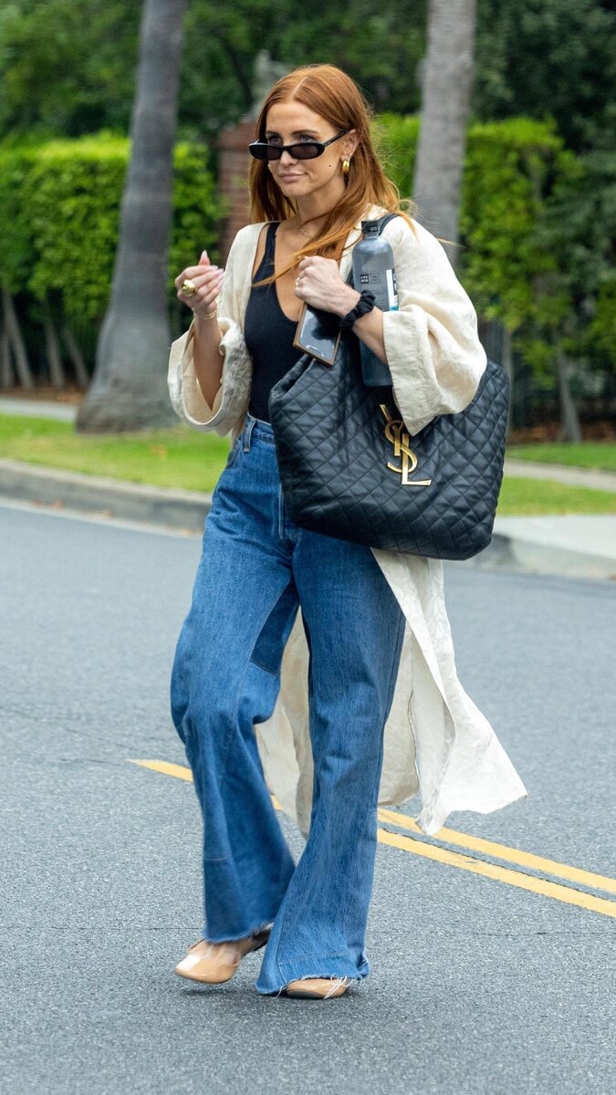 Нет ничего проще и моднее сочетания лаконичного топа и джинсов, и это еще раз подтверждает Эшли Симпсон. Звезда надела облегающую майку с глубоким вырезом и дополнила ее расклешенными джинсами на высокой посадке с необработанными краями. Стильный аутфит она завершила кимоно в молочном оттенке, бежевыми балетками и солнцезащитными очками. Однако все наше внимание приковано к сумке-тоуту Saint Laurent, которая полюбилась и Хейли Бибер, и Анджелине Джоли. Читайте также на нашем сайте: Где покупать сумки в России: 7 модных брендов на любой вкус и бюджет, в которые вы влюбитесь Подписывайтесь на нас в Телеграме, чтобы быть в курсе последних новостей!