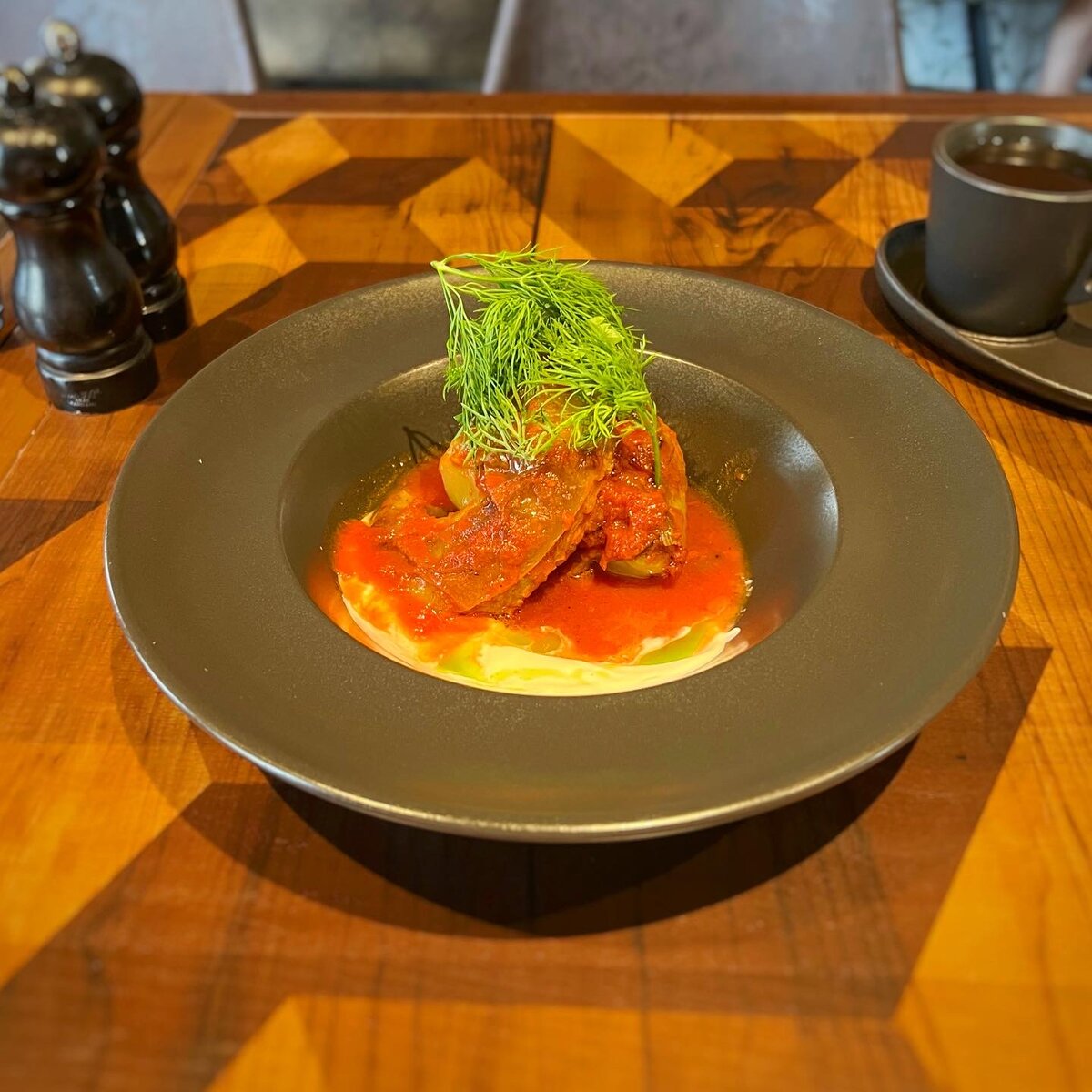 Волею случая отобедал в ресторане «Горячий цех». Наливают приветственный стакан воды. Хлеб с маслом, как раньше, не приносят. Стол не рассервировывают и не протирают — стол в крошках. Заказал перцы фаршированные из дровяной печи с копчёной сметаной из меню «Обеды от шефа» по 320 ₽. Несмотря на название, в тарелке всего один перец. Он плотно набит мясным фаршем вперемешку с рисом. И разрезан вдоль на две части. Эти две части лежат в соусе, который частично сметана, а частично томатный. Сверху конструкция украшена веточками свежего укропа. Царь сибирской кухни — куда же без него. Что по вкусу? Перец действительно запечённый, есть даже пригарки, но они никак не мешает вкусу. Фарш сочный. Сметана названа копчёной, но если и есть в ней копчёность, то она полностью теряется за вкусом томатной пасты. На мой вкус томатая паста здесь излишняя и самый вкусный фаршированный перец — это, конечно же, с большим количеством сметаны. Но повторюсь, это дело вкуса — кому-то, возможно, нравится и