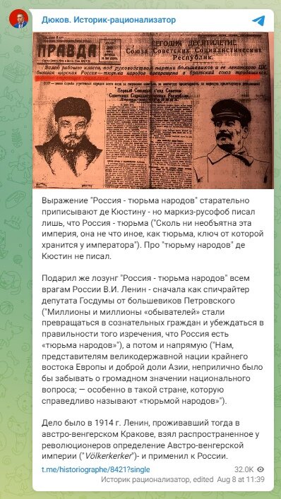 А тем временем господин буржуазный историк из кожи вон лезет, чтобы "доказать", что царская тюрьма народов не было тюрьмой народов. Врали большевики и лично Ленин (который, как установил Дюков, "подарил всем врагам России лживый лозунг "Россия - тюрьма народов"), не было колоний у Российской империи, и нерусские народности не были совершенно бесправны, не подвергались всяческим унижениям и оскорблениям. И даже образование в империи росло более высокими темпами, чем в СССР. В общем, пытается убедить читателя, что революция принесла лишь вред и после нее "никакого качественного скачка не произошло" — ведь нужно в принципе очернять такое передовое (и страшнее для правящего класса) явление общественного развития как социальная революция. Для чего господин буржуазный историк прибегает к разным приемам: выдергивает отдельные факты («Наткнулся на замечательную иллюстрацию к лживому лозунгу "царская Россия - тюрьма народов": в 1883 г. полицейский отряд, обеспечивавший безопасность во время цер
