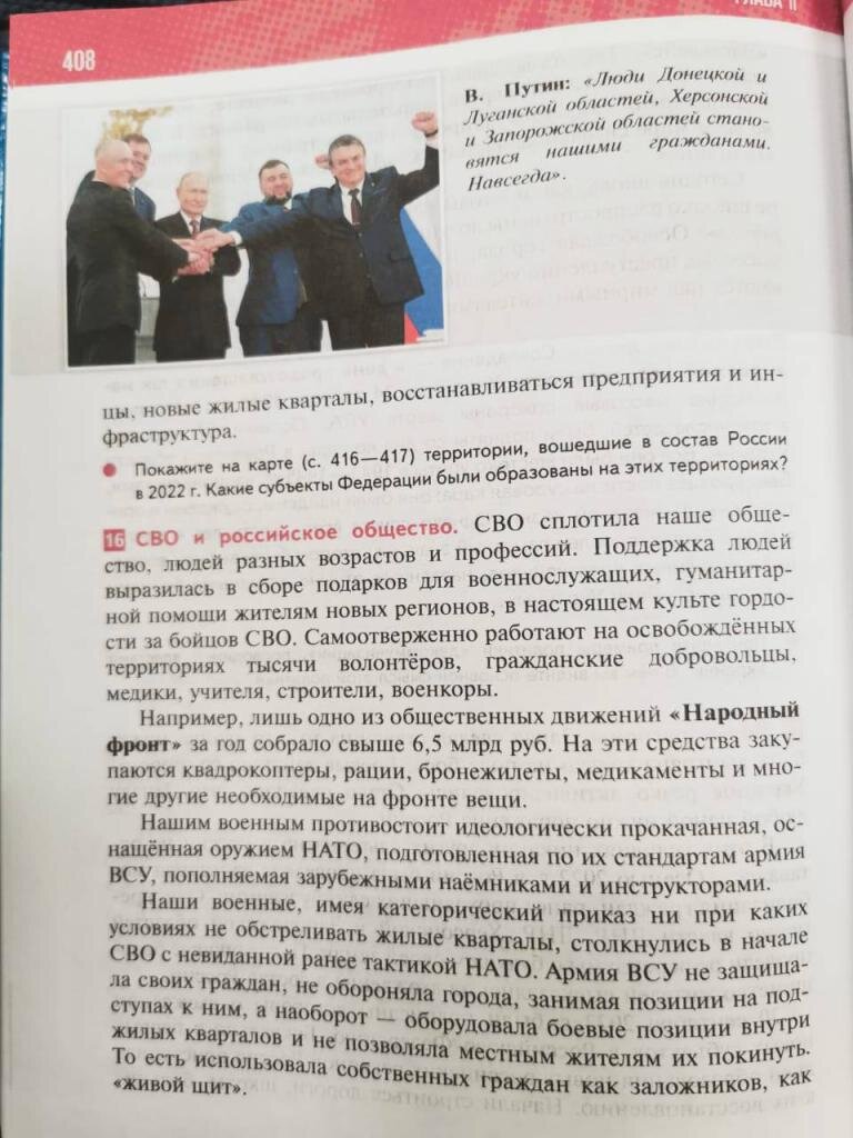 Министр просвещения Сергей Кравцов и помощник президента Владимир Мединский презентовали новый учебник по истории с «главой о СВО». Старшеклассники начнут по нему учиться с 1 сентября этого года. Подробности приводит РБК. «Узнавая в Интернете любую информацию о происходящем на Украине сейчас, помните: мировая индустрия по производству постановочных роликов, вбросов, фейковых фото и видео работает непрерывным конвейером», – говорится в учебнике по истории. В новом учебнике подробно изложены причины и задачи военной спецоперации. На его страницах можно увидеть участников и героев СВО. Известно также, что в ближайшем будущемпоявится и новый учебник по обществознанию. В нем будет сделан акцент на непреходящие ценности общества.