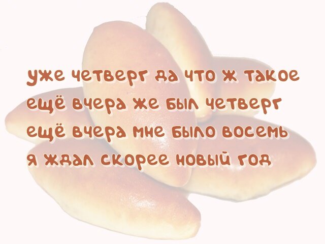 Четверг — повод достать с полки пирожок. Вот у меня уже пирожки подоспели. Традиционно свежие, горячие. С юмором и щепоткой сарказма. Автор немного в отпуске. С детьми. Поэтому не откажется от помощи в лепке пирожков. вот так бывает что разрушен ты сам и весь твой прежний мир но надо как то притворяться живым ещё десятки лет *** в разгаре август это значит что скоро осень и зима дожди и грязь туман и темень и холода и гололёд *** уже вовсю шагает август в объятья брата сентября а я совсем не загорела эх я давай друг другу скажем честно и откровенно на все сто что мы давно уже друг другу никто *** я ощущал себя маршруткой среди автобусов больших железной кружкой средь фарфора морскою свинкою в хлеву *** аркадий говорил оксане оксана я тебя люблю но смысл слов увы был разным тех для него и для неё *** однажды повар вдруг подумал а не напечь ли пирожков нет не напечь решил в итоге и в миску настрогал салат *** казалось не был одиноким казалось были же друзья а оказалось что под о