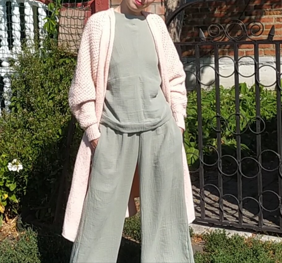 Идея сочетать нежно - розовый кардиган с комбинезоном цвета шалфей показалась мне удачной. Решила, что могу сшить сама по выкройке Burda, отобрала модель из номера 6 2018 года, модель 113. Купила ткань в самом близком оттенке к желаемому, это оказался двухслойный муслин. Начав шить, я пришла к выводу, что ткань совсем не подходит к выбранной модели, да и фигура в комбинезоне выглядела крайне некомплиментарно. Решено было шить отдельно блузу и брюки. В ощущениях муслин просто супер, но в работе пришлось повозиться. Обработка рукавов и и низа блузки далась нелегко, просто подогнуть не вариант, нашивала манжеты, с брюками так не получилось, чем я не слишком довольна. На будущее муслин лучше выбирать четырехслойный, а крой максимально простой с минимальным количеством деталей. При комбинировании с кардиганом вырез круглый либо лодочка, v- образный смотрится не очень гармонично.