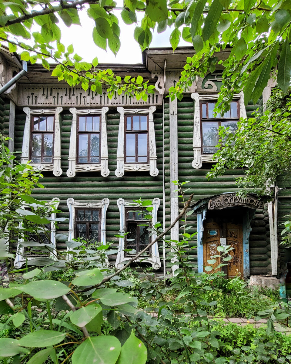 Можно и без кремля, ага. В предыдущей статье — вот ссылка — мы начали у храма Исидора Блаженного с впечатляющей историей, потом продолжили у эффектной гимназии Кекина с обсерваторией. Идём дальше — собирать модерн. Причём деревянный. Он вообще не так часто встречается... ...и я знала про Гороховец и Кимры, а про Ростов понятия не имела. Спасибо краеведу Полине Ленжен — рассказала несколько лет назад. Меня это, конечно, сразу заинтересовало — особенно один терем запал в душу. Увидела его на фотках в интернете — зелёный с резными модерновыми наличниками. И вот если идти от гимназии... ...по улице Моравского и повернуть на Окружную, он сразу и будет. Дом 51 — купца Балмасова, построенный в начале XX века. Только надо постараться разглядеть — зарос до самой крыши зеленью. И вообще состояние не очень — окна побиты, краска облуплена. Но несмотря на это в жизни ещё лучше, чем на фото. Даже современная табличка... ...уже не работающего кафе вписана по стилю идеально. Я ходила и любовалась. Оче