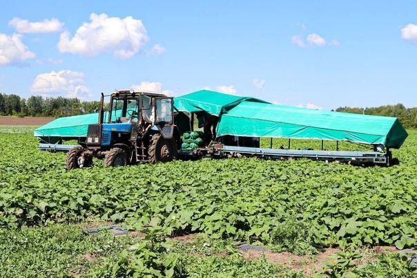 Похожие на крылья самолета конструкции парят над полем на высоте в 40-50 сантиметров. 12 сборщиков огурцов, лежа на матрасах внутри “агрегата”, ежедневно собирают по 500 кг каждый. Сначала овощи попадают на ленту-транспортер, затем - в руки сортировщиков, которые «путешествуют» по полю на этой же платформе, и в сетки.