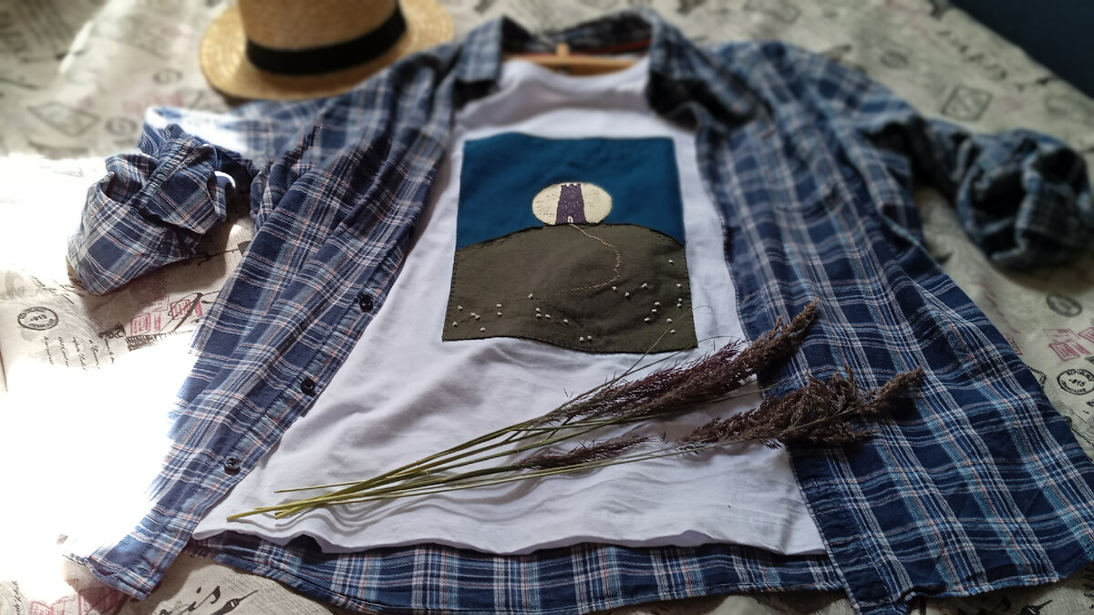 Как и предполагалось изначально, выполнение этого проекта не заняло много времени, даже не смотря на то, что аппликация на этот раз полностью пришивалась в ручную. Всем огромное спасибо за советы, они были прекрасны! Подстегнули воображение и очень помогли. Воплощение: Работа выполнялась легко, быстро, и прямо наваливалась воспоминаниями о старых сказках, фэнтезийных фильмах и художественной литературы разной степени волшебности. Детали присаживались на термоклей и пришивались вручную. Способность трикотажа скручиваться хорошо передает линию горизонта в сумерках. Правда, из-за этой же особенности мелкую деталь - башню - я вырезала, приклеив шаблон прямо на ткань текстильным клеевым карандашом, и с этим же шаблоном приклеивала к основе. Лохматость футера создает легкую иллюзию гало у луны. Пятна на луне сначала пыталась вышить "сеткой" вроде штриховки, но она смотрелась слишком серьезно и основательно для этой композиции, в итоге поменяла на слегка хаотичные мелкие стежки. Барашки... Ба