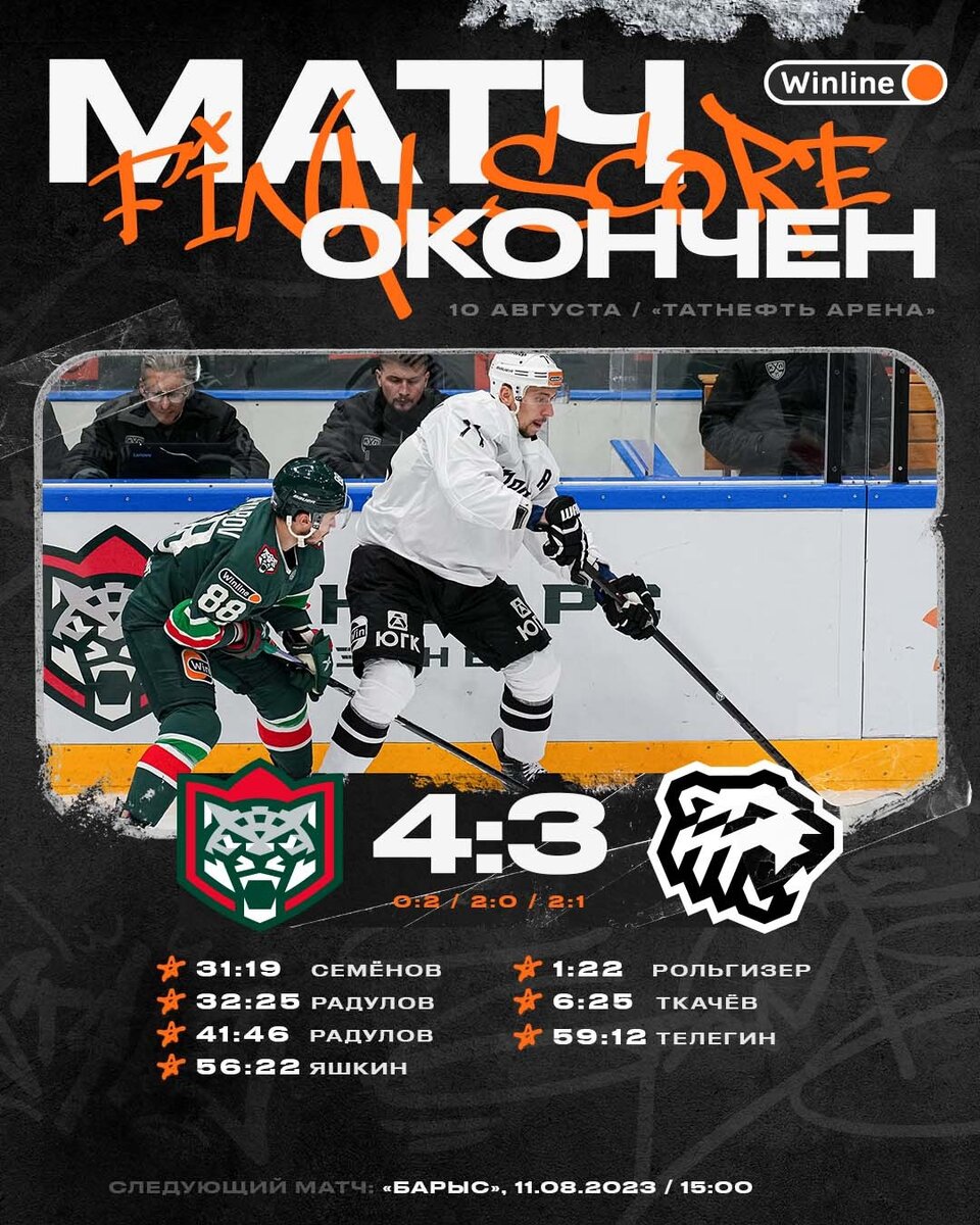 Игровой день на кубке TANECO закрывала игра Ак Барса с одними из гостей турнира Челябинским Трактором. В первом периоде сразу же в игру вступает Трактор и уже на 2-ой минуте матча Михаил Рольгизер точным броском открывает счёт в этой встречи. Второй гол Трактора также не заставил себя ждать на 6-ой минуте Владимир Ткачёв завершает точным броском по пустым воротам хорошую комбинацию Трактора в большинстве. Второй период для Трактора оказался зеркальным. В середине второй 20-ти минутки Кирилл Семёнов реализует свой момент и забивает с неудобной руки прямо в ближнюю девятку Мыльникову. Через минуту Александр Радулов реализует большинство Ак Барса в ближнем бою прошивает вратаря Трактора и счёт перед заключительном периодом становится 2:2. На второй минуте третьего периода Радулов вновь в ближнем бою оказывается сильнее Мыльникова и счёт становится 3:2. За 4 минуты до конца Дмитрий Яшкин после передачи Вадима Шипачёва делает счёт 4:2. За минуту до конца Трактор забивает в большинств