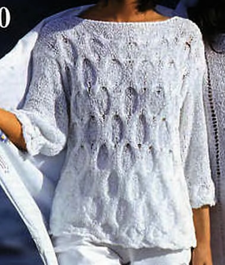 Белый джемпер с рельефным узором (спицами).
