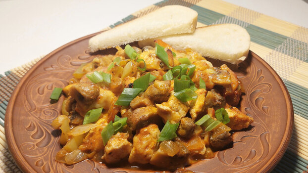 Балканская кухня - это сытные блюда, в которых обязательно присутствуют сезонные овощи, морковь, сладкий перец, мясо, густой соус, часто в рецептах используют грибы. Получается сочно, вкусно и разнообразно. Называют такое блюдо гювеч (по названию глиняной посуды, в которой изначально такое овощное рагу и готовили). Рецептов его приготовления великое множество - ведь рагу будет разным в зависимости от того, какие ингредиенты вы сегодня используете. Можно добавить, предварительно обжарив, баклажаны, кабачки, картофель, убрать томаты и заменить соус на сливочный, использовать стручковую фасоль и цветную капусту... Овощное рагу с грибами и курицей Ингредиенты: - болгарский перец 4 шт.; - курица 700 г; - грибы 400 г; - лук 1 большой; - помидоры мясистые 2 шт.; - морковь 1 шт.; - сыр 100 г; - оливковое масло 50 мл; - томатная паста 1 ч. л.; - сушеный чабер, орегано, тимьян, мята, базилик - по вкусу; - чеснок - 2 зубчика; - соль, перец (черный и острый) - по вкусу. Приготовление: 1. Подготови