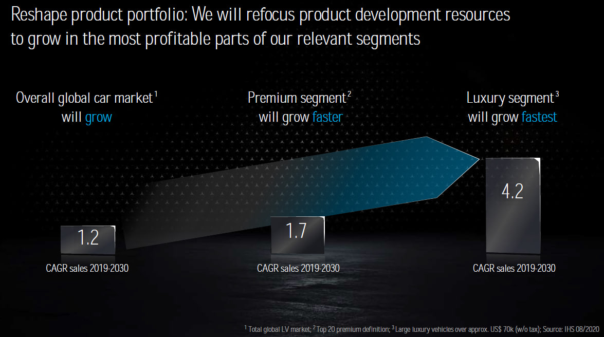 Автомобили бывают массового сегмента, премиум и люкс. Где граница между премиум и люкс? Мерседес-Бенц считает, что это 70 тысяч долларов без налогов. С налогами выходит около 80 тысяч. На слайде из презентации компании это написано мелким шрифтом внизу справа. Вот и получается, что средний Мерседес или Ауди -- это премиум, а Бентли, например, это уже люкс. Вопрос о различии между премиум и люкс возник у читателей после выхода этой заметки: "Мир стремительно богатеет" P.S. Ориентироваться в моих статьях, заметках и видео удобно через НАВИГАТОР Более полный перечень статей с разбивкой по темам есть ЗДЕСЬ. ___ Раньше всего материалы публикуются в Дзен и Телеграм Телеграм : https://t.me/m2econ Дзен : https://zen.yandex.ru/m2econ Подписывайтесь! Буду благодарен вам за лайки и комментарии