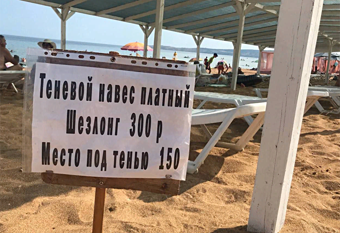 Предприимчивые жители Крыма начала продавать туристам место в тени на пляже. Стоимость такой услуги без шезлонга – 150 рублей, с шезлонгом – 300 рублей, пишет «ТурДом». Говорят, что в прошлом году то же самое было в Феодосии на пляже Барабулька. Тогда это стоило 200 рублей.