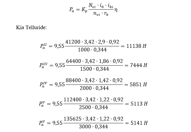 Расчет динамического фактора и тяговой силы Вычисленные значения эффективной мощности двигателя и частоты вращения коленчатого вала дают возможность определить значения тяговой силы на ведущих колесах автомобиля по формуле, где K p - коэффициент размерности. Если в формулу подставляют Nv в ваттах (киловаттах), nv в оборотах в минуту, rk в метрах, то K p = 9,55 и сила тяги выражается в ньютонах (килоньютонах). η - механический КПД трансмиссии автомобиля, для автомобилей с одной главной передачей равен 0,85 - 0,92. Nv переводим в Вт. Силу сопротивления воздуха при разных скоростях находим по формуле, где kw – коэффициент, характеризующий форму тела и аэродинамическое качество машины (коэффициент аэродинамического сопротивления); F - лобовая площадь автомобиля (площадь проекции на плоскость, перпендикулярную продольной оси), м2 ; v - скорость движения машины, м/с; G – вес автомобиля в H. Динамический фактор для каждой скорости движения и передачи определяем по формуле, где Pa ; Pв; G - вы