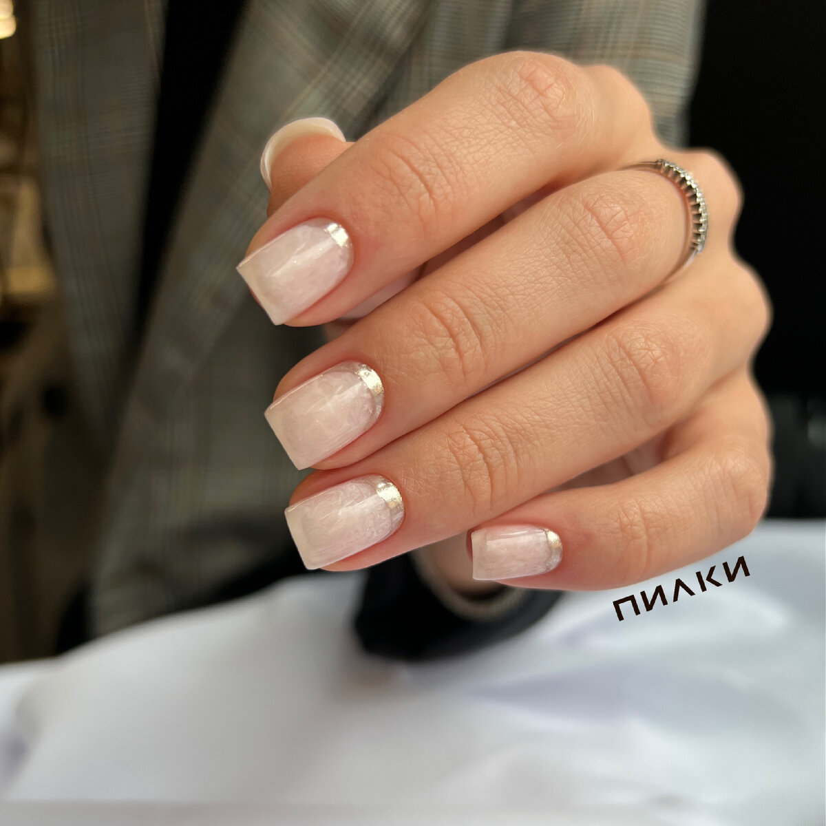 Стрелец — мраморный маникюр с серебряными лунками
