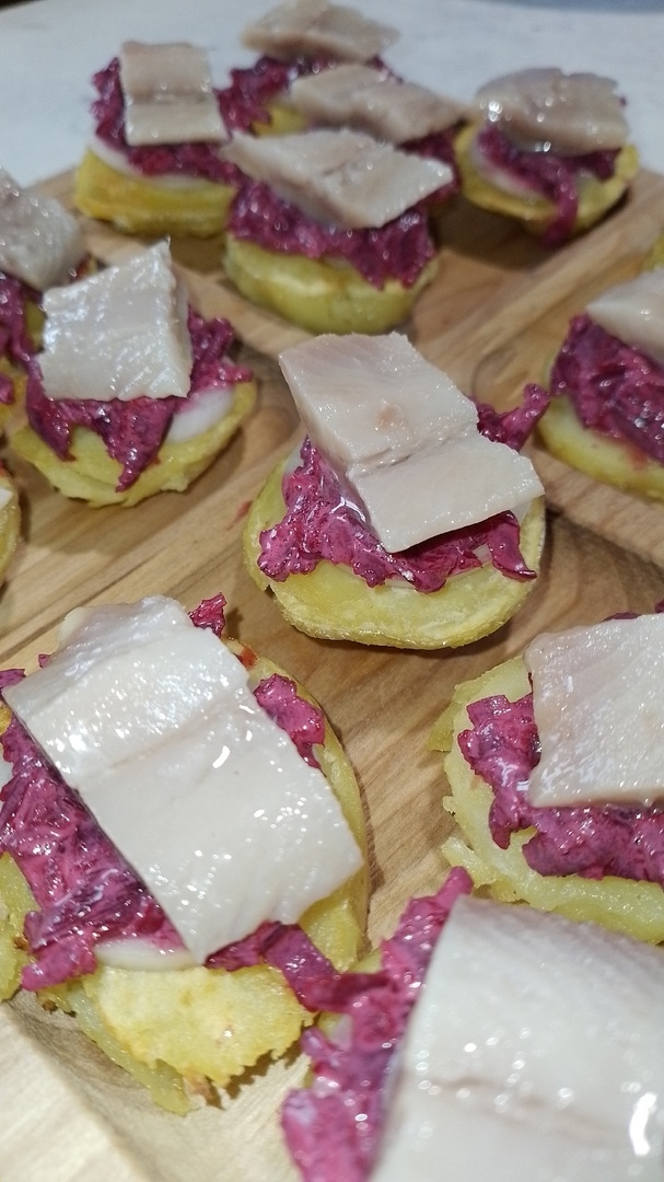 Кладем кружочек картофеля, на него кольцо лука, далее свекла и сверху кусочек селедки. По желанию можно украсить зеленью. Приятного аппетита!