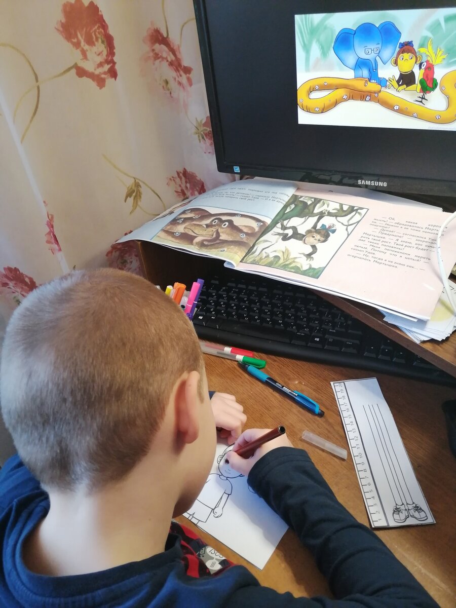 А слонёнок, мартышка и попугай искали и всё никак не могли найти, где же удав порвался. Они дошли уже почти до самой середины, когда из зарослей появилась голова удава.