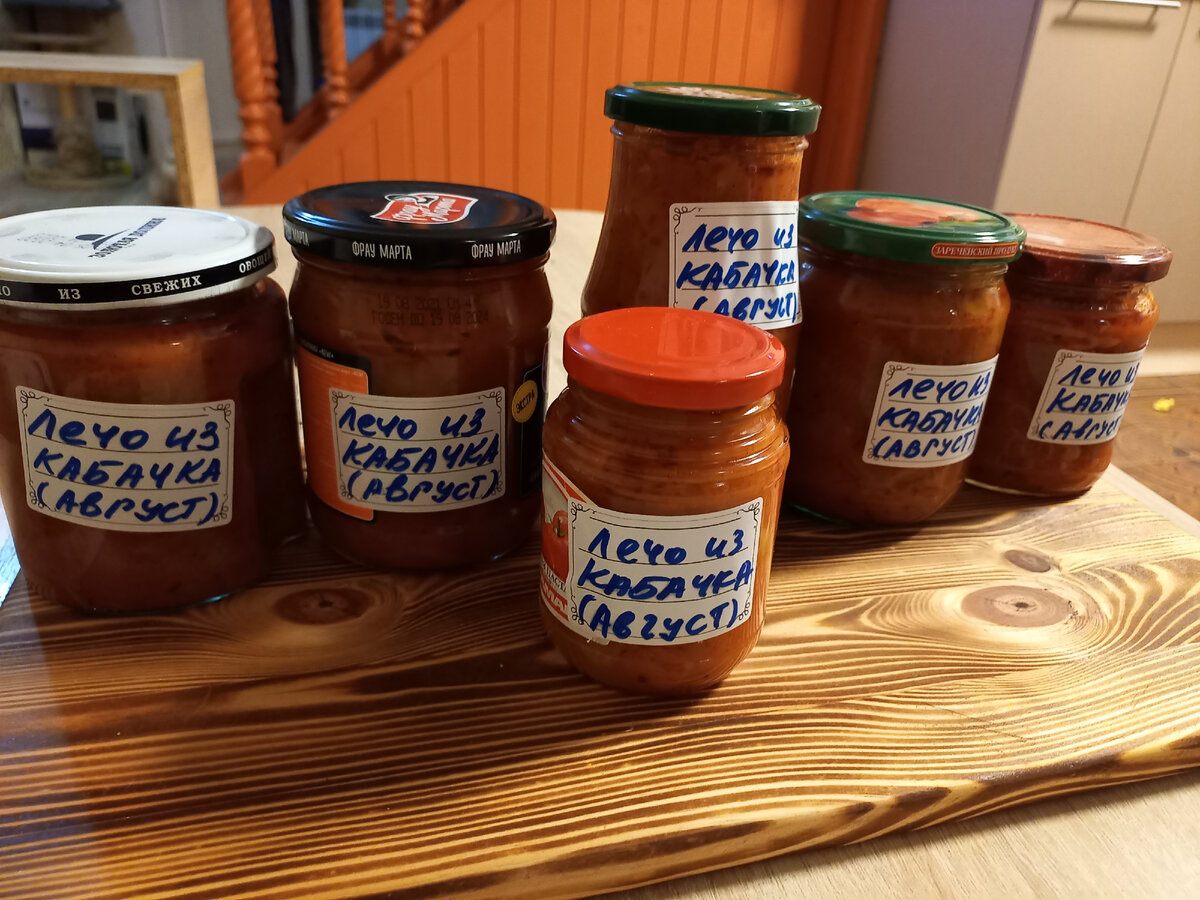 Всем привет! Началась "горячая" пора заготовок на зиму. Кабачков в этом году в избытке, поэтому часть пошла на заготовки. Салат называется "Лечо из кабачков", рецепт был мной обнаружен на листе "отрывного календаря" и немного переделан под себя. Несколько лет я готовлю эту закуску и очень ей довольна. Применяю ее, как самостоятельную закуску, а так же ее можно добавить к отварным макаронам, рису, грече и к отварному картофелю. Готовить не сложно и список ингредиентов не "раздут", все в меру и получается действительно вкусно. Способ приготовления: Кабачки моем, чистим от кожуры и семян. Нарезаем небольшими кусочками. Лук моем, чистим от шелухи, нарезаем полукольцами. Перец моем, убираем семенную коробку, нарезаем "квадратиками". Готовим "заливку". В кастрюлю наливаем воду, растительное масло, добавляем соль и сахар. Добавляем томатную пасту и черный перец горошком. Все перемешиваем, доводим до кипения. Закладываем в кастрюлю кабачки. Нагрев уменьшаем и варим 15 минут. Добавляем пря