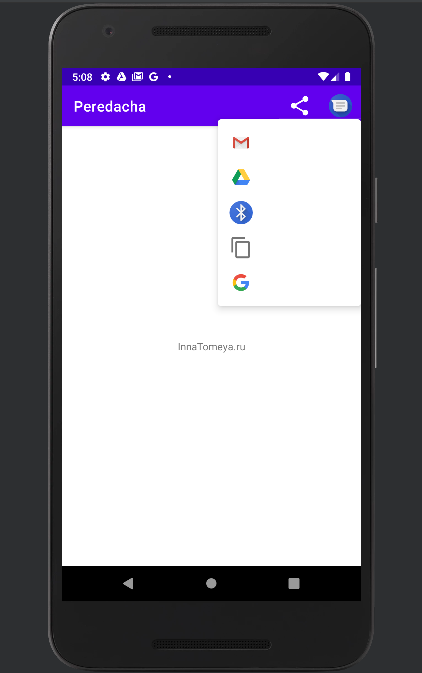 </menu> Где элемент <item> - определяет действие, app:showAsAction="ifRoom" – выводит провайдера действия передачи и