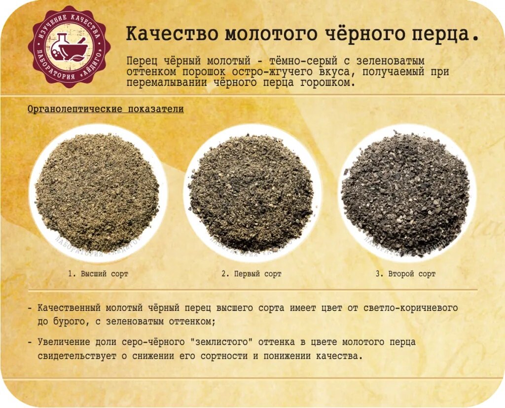 Для получения молотого перца сырье в виде горошин перца сортируется на фракции. Качественный черный перец горошком плотностью 570 г/л используются на производство перца молотого высшего сорта. Молотый перец низших сортов производится из зерен более мелкой фракции с большим количеством легковесных зерен и примесей. Качественный молотый черный перец высшего сорта имеет цвет от светло-коричневого до бурого, с зеленоватым оттенком. Увеличение доли серо-черного «землистого» оттенка в цвете молотого перца свидетельствует о снижении его сортности и понижении качества. Еще одним из показателей качественного молотого перца является степень измельчения и сыпучесть. Для молотого черного перца высшего сорта характерна однородная тонкодисперсная консистенция и сыпучесть без комкования. Цвет качественного молотого перца обусловлен «строением» горошин перца. Ка