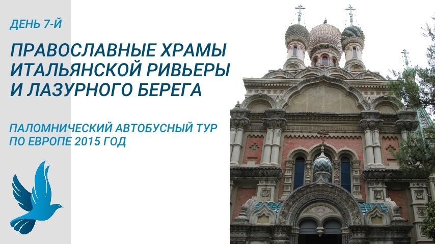 Сразу замечу, что наша утренняя спешка вызвана необходимостью попасть к началу литургии в местном Русском храме, полное и официальное название которого — Православный храм Христа Спасителя в Сан-Ремо. В связи со вчерашним поздним приездом времени на молитвы и исповедь хватило не всем, поэтому значительная часть группы решает не рисковать и исповедоваться прямо в автобусе. Хотя, как оказалось позже, волнение было абсолютно напрасным — мы успели вовремя.