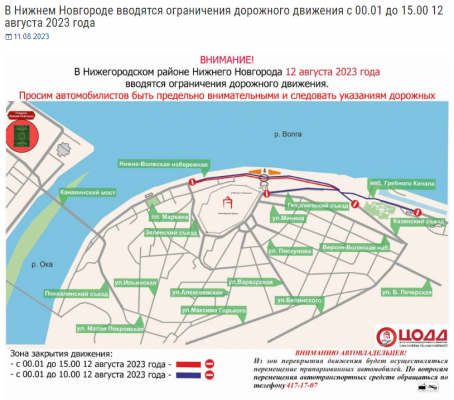 Движение транспорта закроют на Нижневолжской набережной с 00:01 до 10:00 12 августа из-за празднования Дня физкультурника. Об этом сообщает администрация Нижнего Новгорода. Будет ограничен проезд на участке от улицы Широкой до Георгиевского съезда, на улице Красная слобода и набережной Гребного канала.