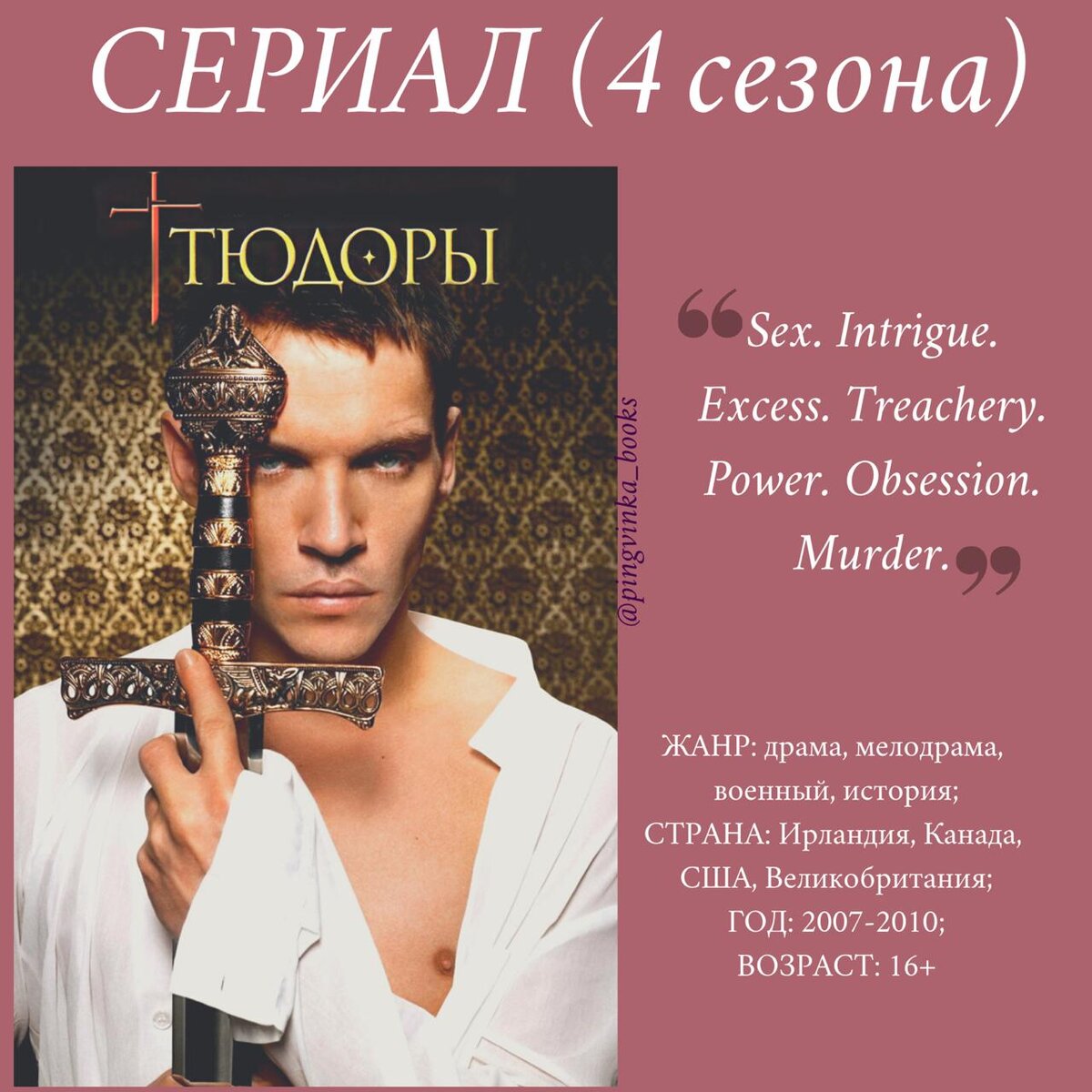 Сериал о жизни и правлении одного из самых знаменитых представителей династии Тюдоров - Генриха VIII Думаю, что большинство знает имя Генриха VIII. И самое популярное, что о нём известно, что у него было 6 жён. И некоторых из них он казнил. ⠀ Моей проблемой с Генриха VIII всегда было то, что я не могла запомнить его жён по порядку, а всё из-за одинаковых имён. Сериал, тем более, что с ним я была так долго, очень хорошо мне в этом помог) ⠀ Список жен Генриха VIII : 1. Екатерина Арагонская; 2. Анна Болейн (казнь); 3. Джейн Сеймур; 4. Анна Клевская; 5. Екатерина Говард (казнь); 6. Екатерина Парр. ⠀ Как видите, три Екатерины, две Анны) ⠀ Очень яркий, красивый сериал. Генрих VIII обзавидовался бы своему экранному герою😉 Говорят, что в последних сезонах актёр отказался набирать вес и сильно менять свою внешность. ⠀ Если брать в расчёт исключительно сериал, то Генрих VIII это монарх, нацеленный на военные действия, которого предавали союзники, которые проводил церковные реформы, но я