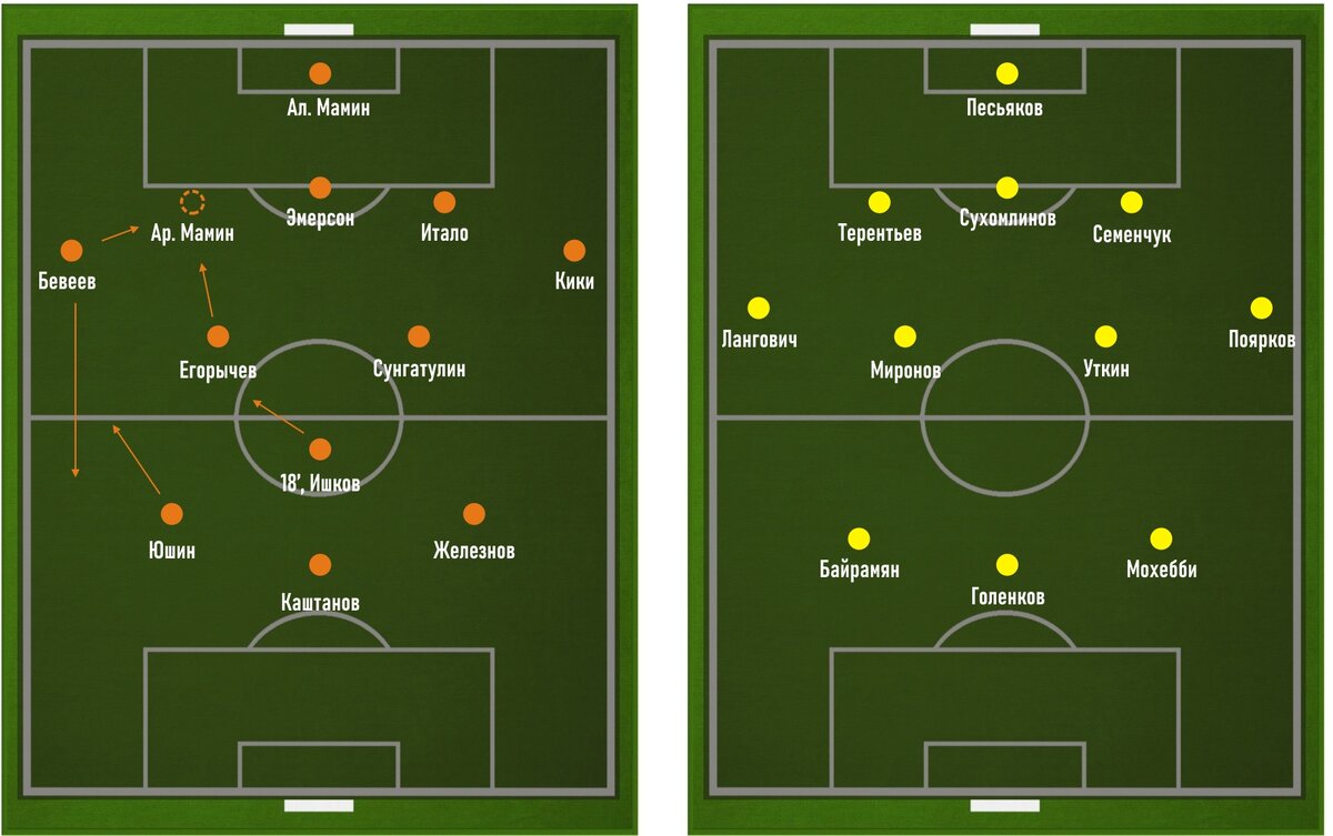 На Кубок «Ростов» выставил состав, далёкий от основного. В то время как у «Урала» вышли основные футболисты с небольшой ротацией. Появились Сунгатулин и Железнов, которым с первых минут матчи чемпионата начинать не доверяют. Второму после этой игры и не начнут. Матч начали следующие составы. На 18-й минуте Мамин был заменён из-за травмы. Видя, в каком составе вышел «Ростов», Гончаренко использовал замену для изменения схемы с 5-3-2 на более атакующую 4-5-1. На пресс-конференции тренер «Урала» сообщил, что не ожидал увидеть запасной состав гостей. Очевидно, что это и стало причиной перехода в более атакующий футбол. После замены Мамина, Бевеев закрыл зону третьего центрального, а Егорычев и Юшин получили задание больше возвращаться в оборону. Если Бевеев подключался по флангу, Егорычев его страховал, Ишков поднимался выше; а если Бевеев переходил в центр, Юшин поднимался к защитной линии. Тем не менее, даже такой состав «Ростова» сначала сильно старался, в чём упрекнуть футболистов Карп