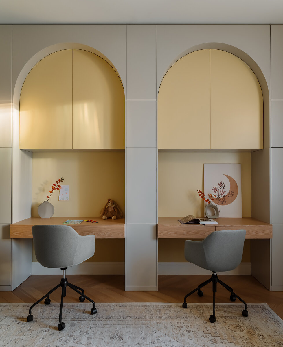 В случае единой рабочей столешницы для двух детей стараемся сохранить личные границы каждого ребенка, используя разграничители — например, в виде органайзеров для канцелярии.
