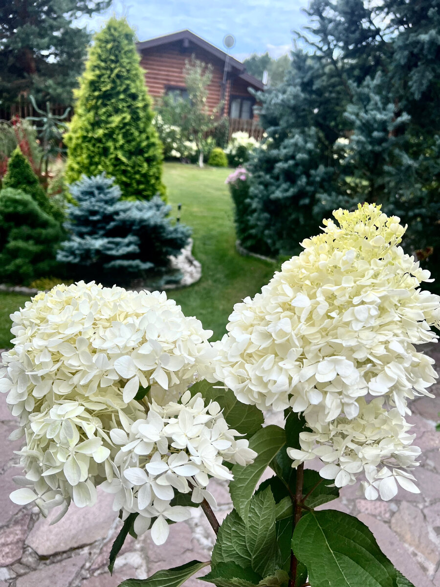 Вот такие две огромные шапки сломались от дождя и ветра. Их даже в руках держать тяжело. Надо ди растить их такими? Эта как раз та гортензия, которая почувстаовала себя штамбом. Мощная гортензия Лайм Лайт. На фото это она одна. Раскинулась в этом году сильно. Весной буду убирать часть стволов по бокам. Вот для этого и нужны фото, чтобы видеть, где убрать весной. А то весной без цветов все скромные стоят. И это еще не полное цветение и на двух толстых стволах огромные соцветия, два отломились прям у основания. Пришлось связать между собой остальные, хотя они очень крепкие. А некоторые побеги, которые выросли за этот год уже по полтора метра Причем это не только у нее. И Фрейз Мельба решила отличиться. Ну ее рано показывать без яркого цвета, но покажу соцветия - от старых побегов, которые помельче и уже белые и от нового метрового побега 😂. На него пальцем показываю. Заметная разница, да? Позвала даже мужа, который любит огромные шапки😊пожалели вместе отломанные побеги Лайм Лайта. Т