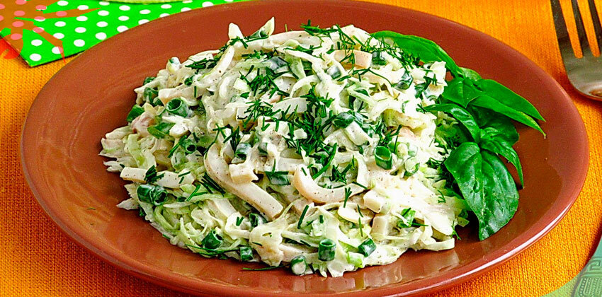 Ингредиенты: Для начала промываем кальмары, заливаем горячей водой и оставляем на 2 минуты. Смываем свернувшуюся кожицу, удаляем оставшиеся внутренности и позвоночник. Опускаем тушки в кипяток и отвариваем 5 минуты. После чего достаем кальмаров, остужаем. Разрезаем тушки на 4 части, затем нарезаем соломкой. Капусту шинкуем тонкой соломкой. Зеленый лук измельчаем. Капусту посыпаем солью и перетираем. Затем добавляем лук и кальмаров. Перчим, солим по вкусу, заправляем майонезом и тщательно перемешиваем. Блюдо готово. Приятного аппетита! Источник: https://wildcrab.ru/news?id=2128