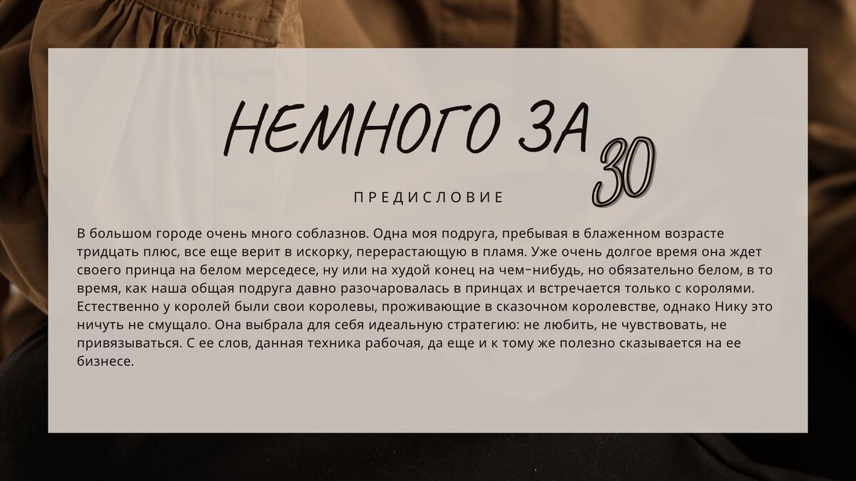 Надо сказать, что нас когда-то связывали не только рабочие отношения. Это был период, когда за мое воспитание взялась Ника и нашла мне идеальный антидепрессант. Прежде, такие отношения для меня были чем-то вроде табу, но поддавшись слабости и стойким убеждениям опытной подруги, я все же рискнула. Надо сказать, что антидепрессант из него вышел так себе, но я немного развеялась.