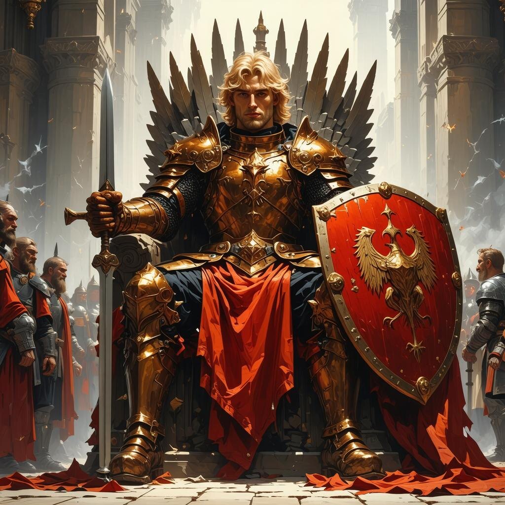 На троне чарских королей он восседал гордо, как и полагается истинному правителю. Его белокурые волосы спадали на плечи. Ярко-красные доспехи, в которые он был облачён, блестели под светом факелов, освещающих комнату. Рядом с троном стоял треугольный щит с изображением грифона держащего в руках меч и щит с родовым символом Гарделей (перекрещенные гиря и факел) – щит Данкварда Завоевателя. Мужественный профиль Данкварда с цепким, но в то же время по-отечески добрым взглядом, взирал на собравшихся феодалов.