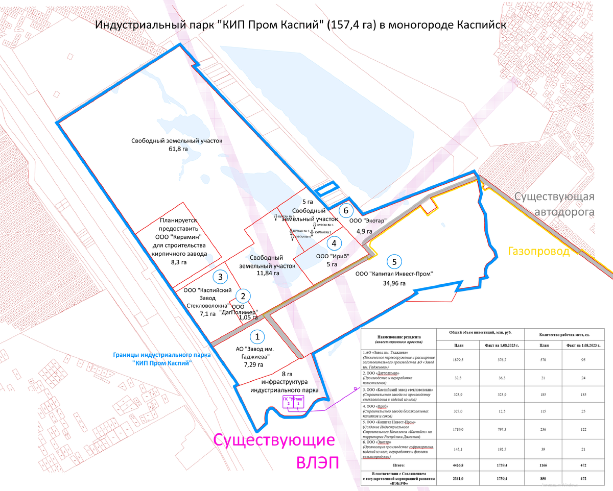 В настоящее время на индустриальном парке «КИП Пром Каспий» расположено 6 инвестиционных проектов, из которых 2 проекта реализованы и введены в эксплуатацию (ООО «ДагПолимер», ООО «Экотар»), 2 проекта находятся в завещающей стадии (ООО «Каспийский завод стекловолокна», ООО «Капитал Инвест-Пром») и 2 инвестиционных проекта находятся на стадии реализации (АО «Завод им. Гаджиева», ООО «Ириб»). По состоянию на 1 августа 2023 года общий объем фактически привлеченных инвестиций в рамках реализации инвестиционных проектов составляет 1739,4 млн рублей, число созданных рабочих мест - 472 единицы.