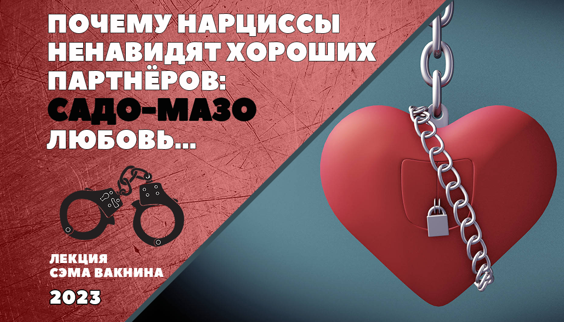 Сегодня мы будем обсуждать нарциссическую, в кавычках, любовь. Нарциссы неправильно интерпретируют определенные ситуации, определенные эмоции (в основном негативные эмоции), а также определённые внутренние процессы. Они маркируют их как любовь. Но, на самом деле – это проявление садистических и мазохистических импульсов. Нарцисс – это садомазохист. Комбинация садиста и мазохиста.