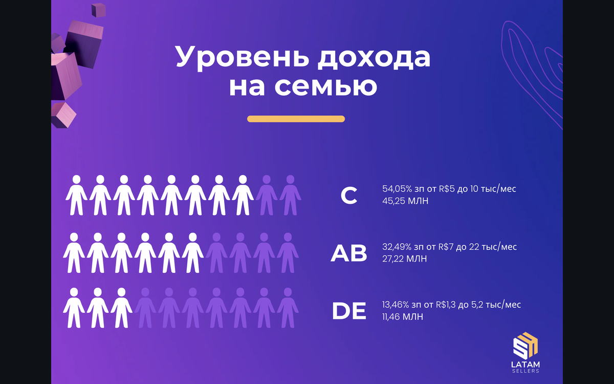 Всем привет! На связи Николай Рапаев. Сегодня хочу рассказать про особенность бизнеса в Бразилии, по сути очень похож с другими странами Латинской Америки. В Бразилии неплатежеспособная аудитория? До посещения Бразилии мне казалось, что тут люди живут в фавелах, опасно выходить на улицу после захода солнца, все дешево. Все эти клише у меня слетели сразу после прилета. Во-первых тут недешево, если мы сравниваем с странами СНГ. Жилищный фонд представляет из себя закрытые кондоминиумы, лучшие в которых я где либо жил. И безопасно живется. Безусловно где то есть фавелы, где-то есть бедные, где-то может и дешево, но это очень локально. Теперь от мнения к фактам, в Бразилии 86% онлайн-покупок приходится на классы A-B-C это семьи с доходом от 140 тыс до 440 тыс рублей в месяц на семью, а ЭТО 72,4 МЛН ЧЕЛОВЕК. По сути меня как предпринимателя интересует эта аудитория. При этом средний чек составляет 94,8 долларов. У этого есть тоже причины это особенность менталитета и развитой систе
