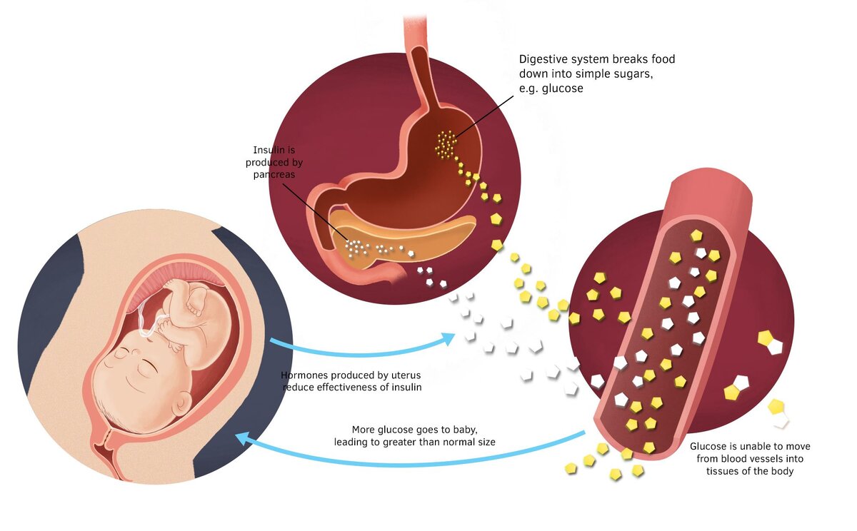Гестационный сахарный диабет - заболевание, которое появляется во время беременности у женщин, у которых до этого диабета не было. Что это значит? Вне беременности нормальным показателем уровня глюкозы в крови считается значение до 6,0 ммоль/л включительно. Но у беременных все иначе. Уровень сахара становится ниже, из-за счет расходов на развивающийся плод, снижения образования глюкозы в печени и других процессов. Поэтому значение глюкозы у беременной натощак 5,1 ммоль/л и выше (но до 7,0 ммоль/л) даже при однократном определении говорит о гестационном сахарном диабете. Выше 7,0 ммоль/л - это манифестный диабет, который требует незамедлительного обращения к эндокринологу и начала терапии инсулином. Часто это означает, что сахарный диабет был и до беременности, но не был выявлен. Почему это важно? Гестационный диабет опасен тем, что может стать причиной ряда осложнений во время беременности и родов, а именно: мертворождение, самопроизвольного прерывания беременности, высокий ри