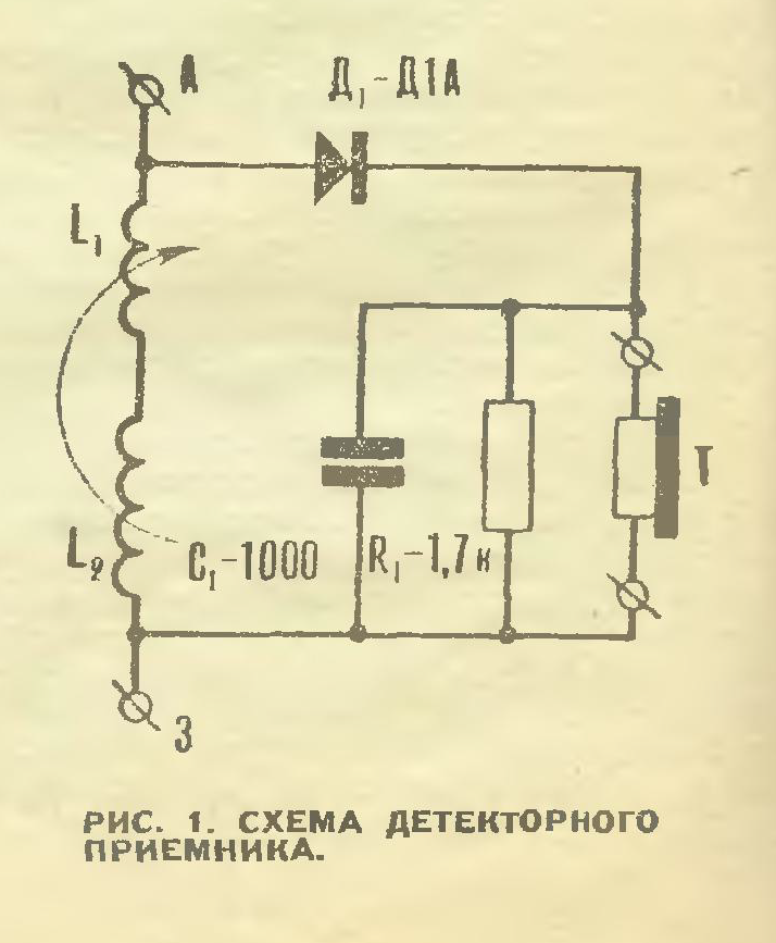 из страниц журнала "Моделист Конструктор» № 12 1966 год Твой первый детекторный приёмник сможет принимать всего одну радиостанцию. Это немного, но ведь первая работа и должна быть простой. Схему приёмника вы видите на рисунке 1. Это так называемая принципиальная схема которая показывает какие детали применяются в конструкции и как они соединяются между собой. Вот, например, диод Д1. Он расположен между гнездом А и наушниками. К гнезду А подключён ещё вывод катушки L1. А сопротивление R1 и конденсатор C1 подключенны параллельно гнёздам телефонов. Зачем стрелка пересекает катушки? Она показывает, что одна катушка, например L2 должна быть неподвижной, а L1 — перемещаться, приближаясь к катушке L2 или удаляясь от неё. При этом меняется общая индуктивность контура и приёмник можно настроить на радиостанцию. Как только это произойдёт, заработает цепь детектора — диод Д1, конденсатор С1, и сопротивление R1. Она выделит из принятого сигнала звуковые колебания и подаст их в наушники. Детал