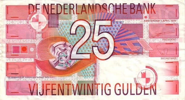 Первой была выпущена (в 1989 году) банкнота в 25 гульденов. В основе изображения лежат геометрические фигуры разных оттенков красного, розового и лилового цветов, а в центре оборотной стороны – также сложная абстрактная геометрическая фигура.