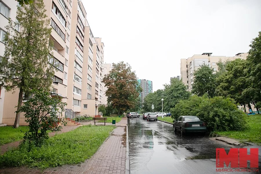 Один из таких дворов расположен возле дома № 4 на улице Мележа. Подходы к подъездам, мусороприемным камерам и тротуар до крайнего бордюра вымостили темно-бордовой мелкоразмерной плиткой при капремонте, который завершился в конце 2022-го. Дворовая территория с особенностями — вытянутая, но неширокая, и значительную часть ее занимает проезд. Его новенькое асфальтовое покрытие во время нашего визита блестело под моросящим дождем.