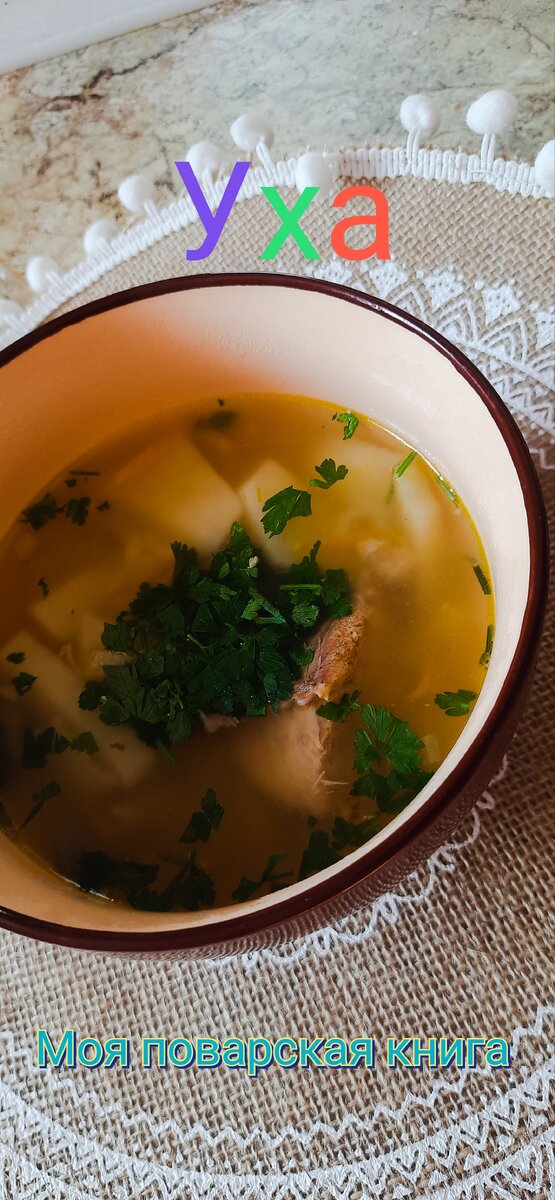 Не люблю замудреные рецепты. А люблю простые. Муж любит разные супы,уха в том числе. Без первого на обед, день у него прошёл не по уставу значит . На 5л. кастрюлю беру: Голову кеты и хвост. Отвариваю их 45 минут с цельными луковицей и морковью. Пока варится бульон, чищу картошку 4 шт. ,луковицу 1 шт,морковь,промываю рис 250 грамм. Лук и морковь пережариваю. Как сварится рыба . Вынимаю на тарелку,чтобы разобрать на кусочки. В бульон кладу картошку порезанный средними брусками. Варю минут 10. Потом кладу промытый рис. И зажарку. Варю минут 10 еще. Соль, перец и лаврушку добавляю по вкусу. За 5 минут до окончания варки добавляю рыбу и зелень. Кости оставляю.Т.к. муж любит их муслякать. Иногда в зажарку кладу томат. Надеюсь суп ему понравился. А мы уехали в деревню. Так что не знаем ..понравился ли.🤗