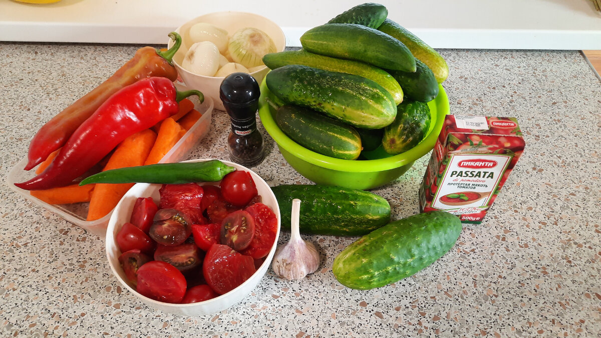 Доброе утро. Август самый активный месяц в приготовление заготовок. Очень много дождей и у меня в этот раз очень много переросших огурцов, из них закрываю несколько видов салатов и заготовку на рассольник. Из переросших огурцов готовлю икру. Собираем всё что выросло на участке. Огурцы- 3,5 кг( после чистки вышло 2,600) Помидоры - 1 кг( пропустить через мясорубку) Перец красный - 500-550гр. Лук репчатый - 500 гр. Морковь - 500 гр. Чеснок -1 головка. Сахар - 60гр( 3 ст.л) Соль крупная - 40 гр( 3 ст.л) Уксус 9% - 40 гр.(3-4 ст.л) Растительное масло - 200 мл. Томатная паста -150 гр( 6 ст. л) Перец Чили- 1 шт. Перец чёрный-1/2 ч.л. Паприка - 1 ч.л. Куркума - 1ч.л. Готовим все овощи. Морковь потереть, лук нарезать ( можно не очень мелко) Помидоры, перец Чили, чеснок и красный перец можно порезать или через мясорубку. Огурцы почистить и потереть на крупной тёрке. Очень крупные семена удаляйте. Если у вас позволяет кастрюля то морковь и лук можно пассировать вместе. Часть масла беру из р