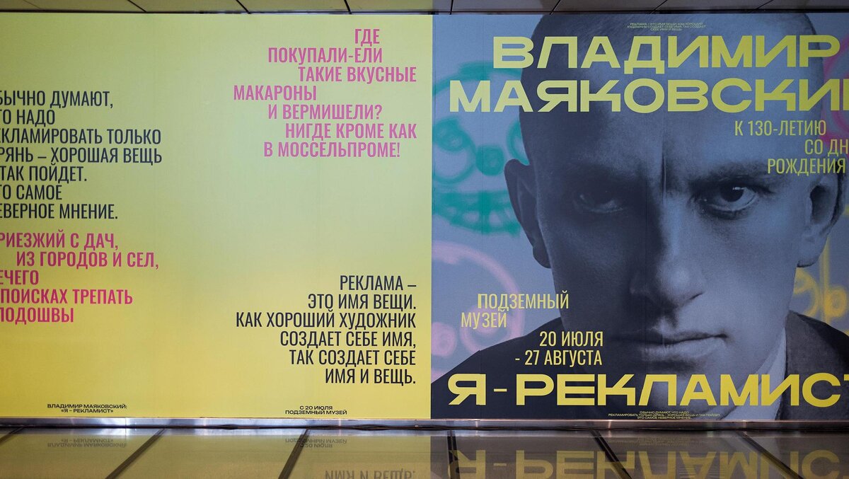 Поэт, бунтарь, актер, сценарист — у Владимира Маяковского было много ипостасей. Об одной из них вспоминают нечасто. Автор «Флейты-позвоночника» заложил основы современной рекламы, а его плакаты, продвигающие обувь в ГУМе и продукты в Моссельпроме, в буквальном смысле слова двигали торговлю молодого советского государства. Обо всем этом рассказывает выставка в Подземном музее «Зарядья» — «Владимир Маяковский: «Я — рекламист“», приуроченная к 130-летию со дня рождения поэта.